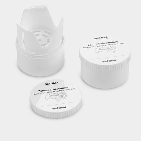 melident Zahnprothesendose ohne Siebeinsatz - sichere Verwahrung durch praktischen Schraubdeckel - personenbezogene Beschriftung auf dem Deckel möglich - stabiler Kunststoff - spülmaschinengeeignet bis 93 C - Außenmaße: 95 mm x H 60 mm - Farbe: weiß - Verpackungs-Einheit: 5 Stück