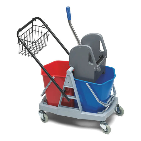 Robustes Kunststoffgehäuse mit 4 Lenkrollen und Klappbügel. Stabile Mop-Presse mit Metallgriff. Praktischer Ablagekorb für Reinigungsutensilien.